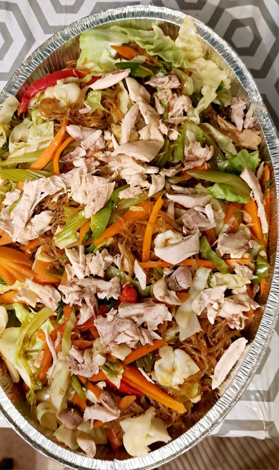Pancit Bihon, is made from delicate rice noodles and stir-fried with a colourful blend of fresh vegetables, tender chicken, and savoury soy sauce.